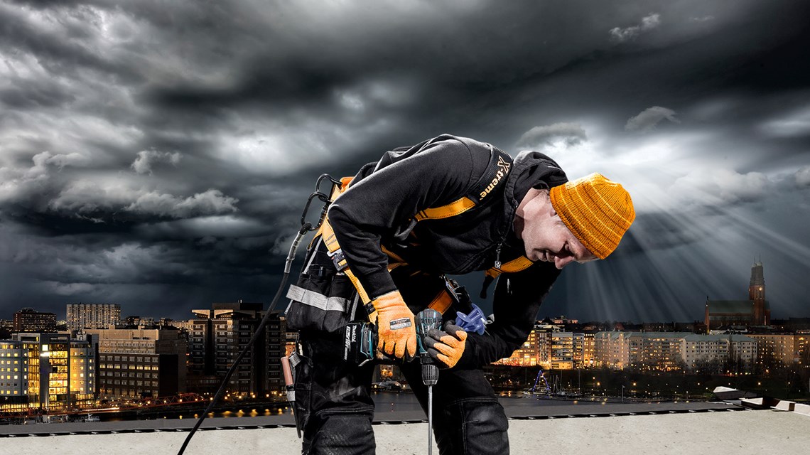 Fotograferingen genomfördes på ett vanligt tak lokalt i Strängnäs, och sedan retuscherades Stockholm stad och en dramatisk himmel in i bilden. Färgerna anpassades till företagets färger och resultatet blev en stark bild som talar för sig själv.